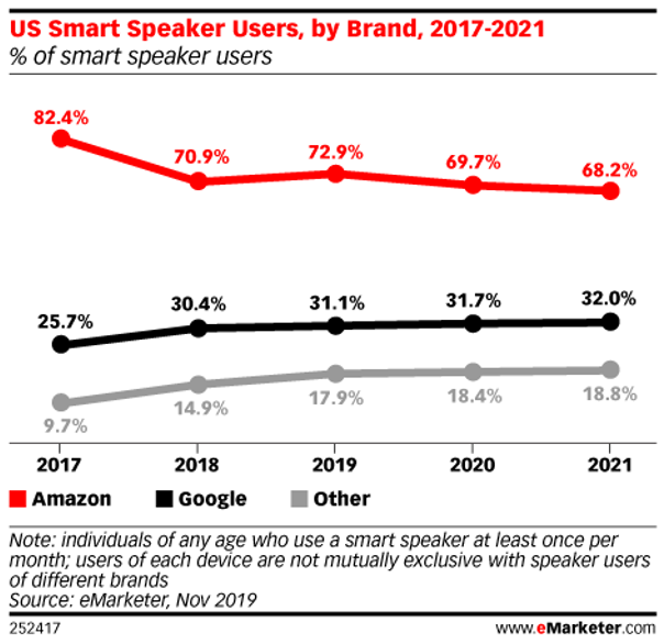 In the chart above, we can see Amazon maintaining a strong majority in the market even as it matures, with no viable alternatives making significant inroads. According to TechCrunch, approximately 30% of internet users have adopted smart-home speakers, and year-over-year sales are showing slower growth. This slowdown is a concern for Amazon, leading them to consistently lower the price of the Echo Dot to spur adoption. Despite this, the fundamental utility of smart speakers for most users remains relatively unchanged.