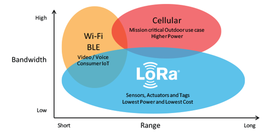 Figure illustrates the low bandwidth and wide interval of range of LoRa compared to Wi-Fi and Cellular.