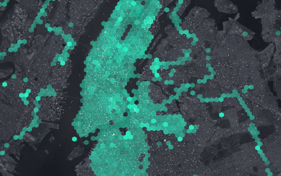 The map above illustrates the H3 grid in New York City, white dots represent gateways.