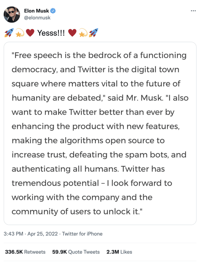 With news breaking that Elon Musk will be acquiring Twitter for $44 billion, the possibilities are endless for where he could lead Twitter. One likely change is that twitter may be moving towards web3 consensus mechanisms. Elon recently tweeted “I hope that even my worst critics remain on Twitter, because that is what free speech means,” potentially implying Twitter’s new direction to be a more decentralized ecosystem that does not incentivize gate keepers to “mistakenly” ban certain targeted users or coincidentally remove tweets.