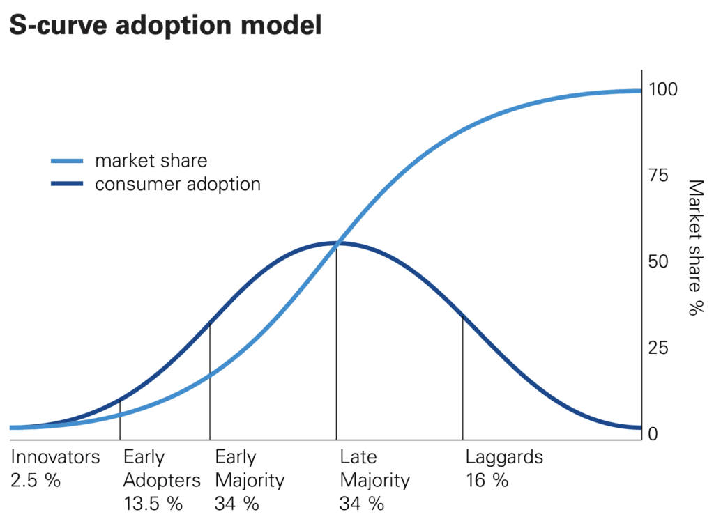 Once adoption reaches critical mass as the early majority enters, total percent adoption tends to accelerate. KPMG’s “Consumer Adoption: How to predict the tipping point” substantiates this idea, illustrated by the S-curve adoption model. Despite being the most dangerous four words in finance, we are open to the idea that in this crypto bull cycle, “this time is different.”